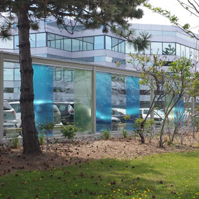 The City of Markham experienced a serious problem with bird deaths when they first relocated their municipal building to a newly constructed atrium style structure at 8100 Warden Avenue. Convenience Group Inc. solved this problem by installing an attractive graphic window film solution called Feather Friendly® to the exterior glass surfaces up to tree-top level. Subsequently, the building owners of the complex at 88 McNabb in Markham wanted to add a covered walkway to their parking area. A glass-enclosed walkway design was conceived by the Toronto architectural firm of Page+Steele and was conceptualized in the initial design phase of the building but not installed until after it was constructed. The walkway structure, directly linked to the building was designed as a windbreak as well as a protected walkway to provide safe passage to the parking area. The prior problem experienced by the city, with birds colliding with building glass, made it clear that adding a glass enclosed walkway along the property perimeter would present a similar difficulty.