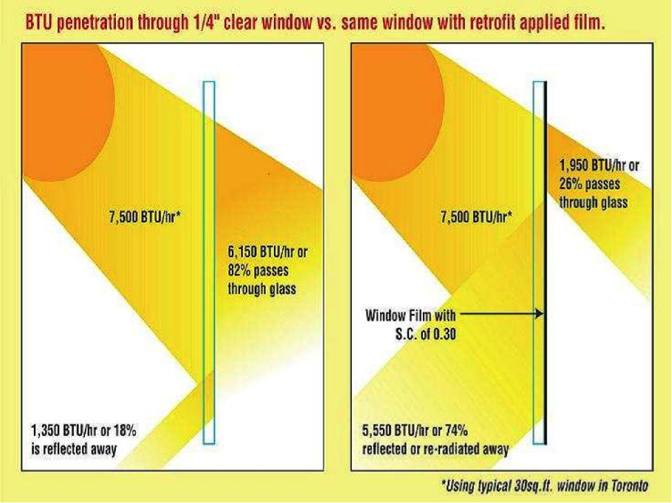 From an energy perspective, window films reduce up to 80% of unwanted solar heat and glare. As a result A/C demand is lowered. Additionally, peak power demand is greatly reduced and the use of A/C during the shoulder seasons is minimized. To prove this point, there have been a number of documented cases in multiple chiller installations where one of the chillers could be shut down after sun control film had been installed.